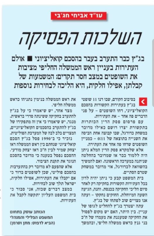 מילה לסיום על התנועה למען איכות השלטון, היא מבקשת לפסול את החיקוק שעיגן את מעמדו של חה"כ בני גנץ כראש ממשלה חילופי. כמות העתירות שהגישה לפתחו של בית המשפט העליון מדמה כאילו אנשי התנועה למען איכות השלטון סבורים כי בג"ץ יושב גם בשבתו כראש ממשלה חילופי אשר יכול להחליט בכל נושא ועניין. האם הם יתמכו בביטול תפקידו זה של בג"ץ? תשאלו אותם.